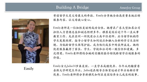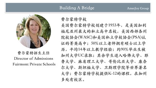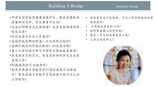 专精美国中小学留学10年的“美意留学”主办这次大型活动,集我们美国本地20-30多年宝贵经验,筛选留学、升学、和生活相关各行业顶尖资源,帮您少走弯路,让您和孩子留学及在美国的教育、生活都顺利和成功。